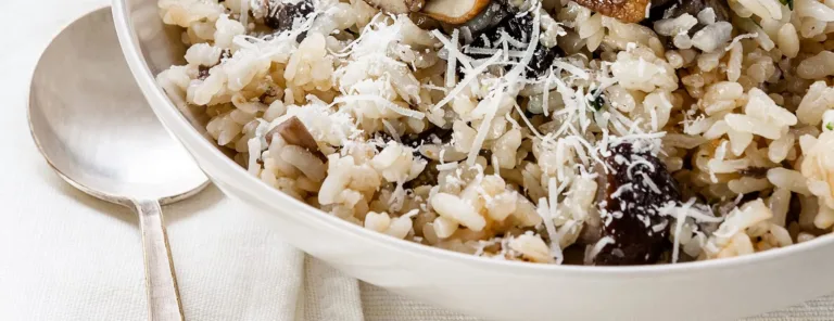 Verhit de olijfolie in een ruime kookplan en bak hierin de witte uit zonder te kleuren. Voeg nu de rijst erbij en laat even meebakken.\Doe de wijn erbij en laat deze absorberen. Vervolgens lepel voor lepel de bouillon toevoegen. De volgende lepel pas toevoegen als het vocht van de vorige is opgenomen. Voeg na ongeveer 20 minuten wat truffelboter toe om zo het garingsproces te stoppen.